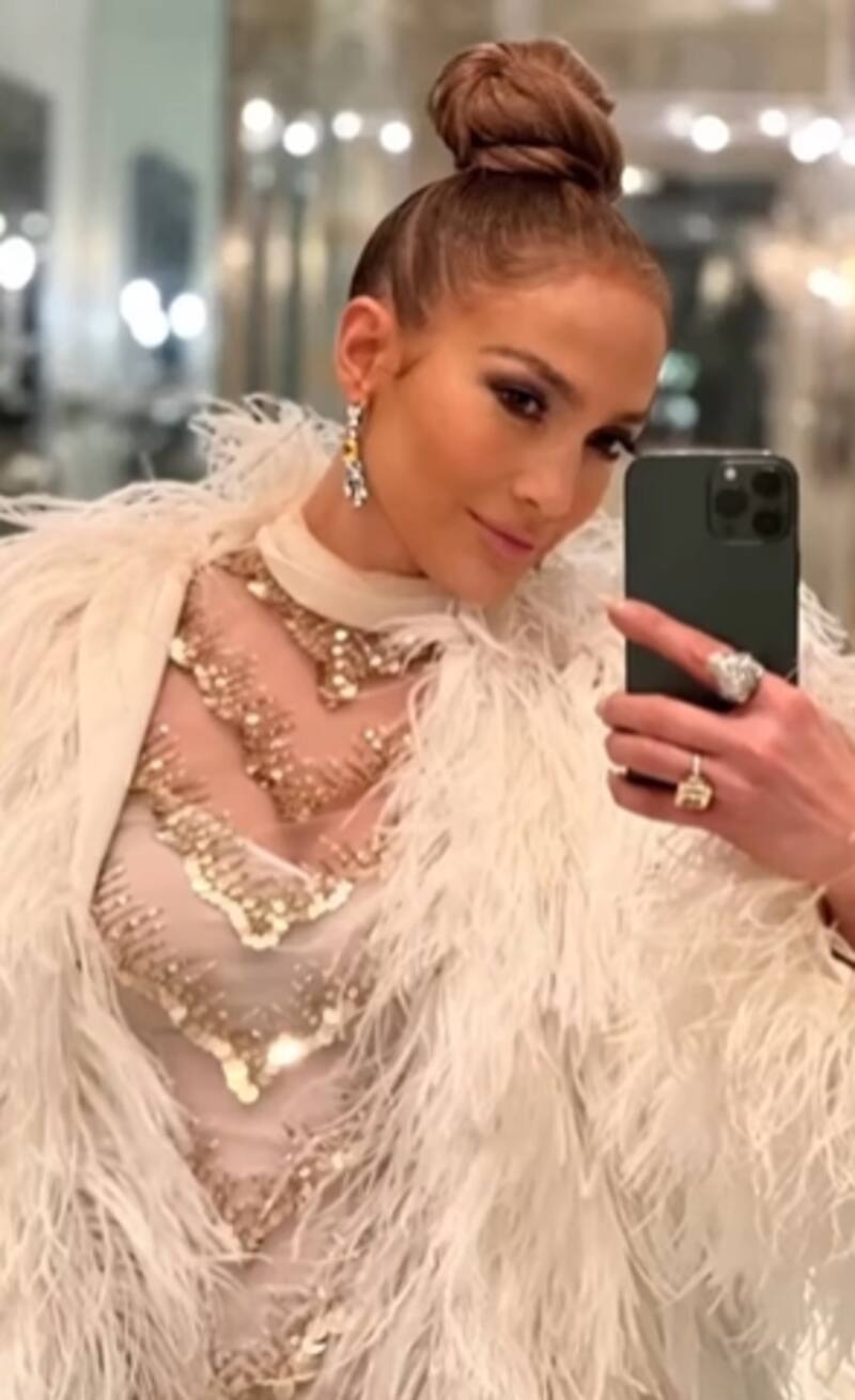 Jennifer López eligió un hermoso vestido blanco con detalles en dorado y transparencias para la ocasión. Estaba firmado por Valentino, era muy elegante y brilloso con minifalda, manga larga y cuello redondo. Lo combinó con muy altos zapatos color crema, aretes colgantes con diamantes, grandes anillos, un moño grande en el pelo y un maquillaje con el que destacaba los ojos.