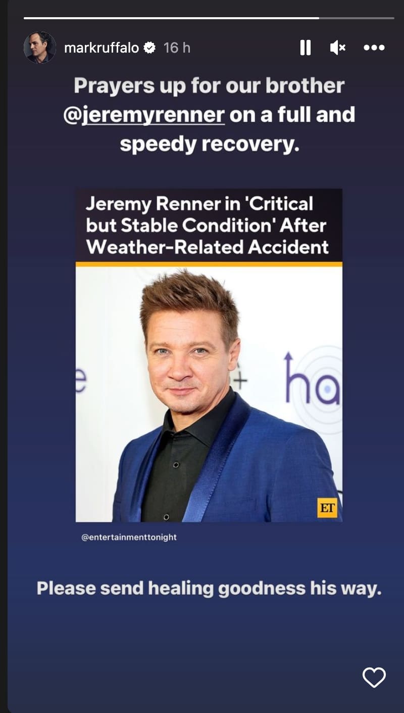 "Pidamos en oración por nuestro hermano Jeremy Renner para que se recupere completamente y rápidamente", escribió el actor de Marvel en sus historias este lunes junto a un reporte de las noticias de la salud del actor.