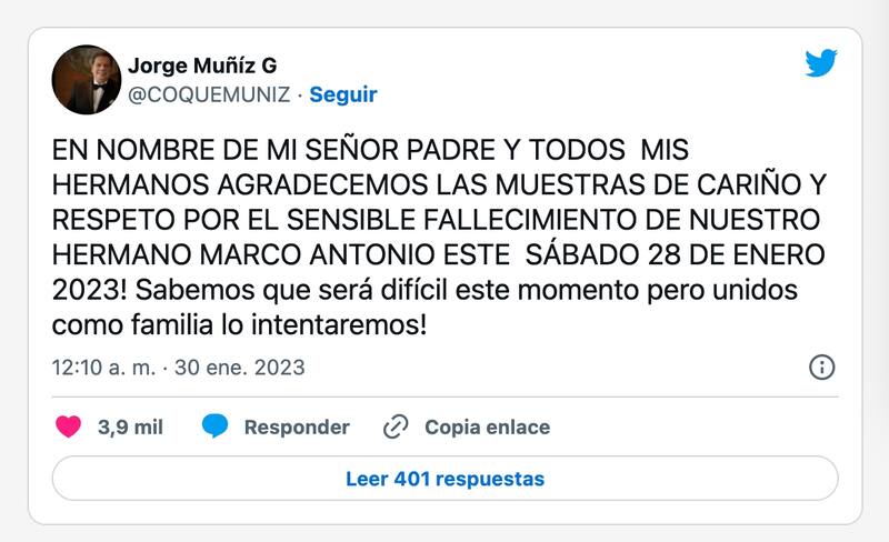 “En nombre de mi señor padre y todos mis hermanos agradecemos las muestras de cariño y respeto por el sensible fallecimiento de nuestro hermano Marco Antonio este sábado 28 de enero 2023. Sabemos que será difícil este momento pero unidos como familia lo intentaremos.