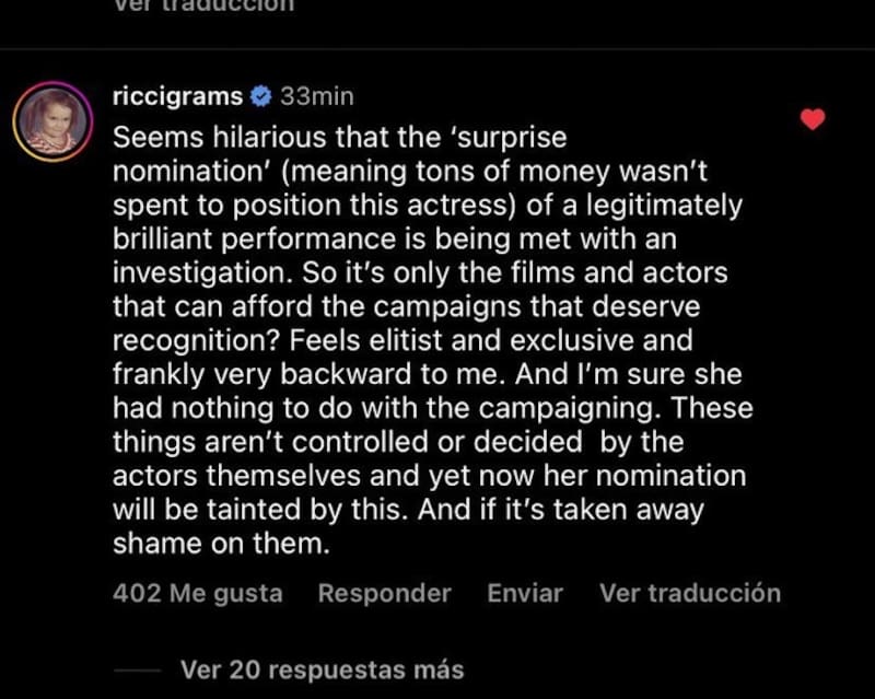 Christina Ricci, por su parte, sostuvo en un tuit ya borrado: "Parece gracioso que la 'nominación sorpresa' (lo que significa que no se gastaron toneladas de dinero para posicionar a esta actriz) de una actuación legítimamente brillante esté siendo investigada", dijo. "¿Entonces solo las películas y los actores que pueden pagar las campañas merecen reconocimiento?... Si se lo quitan, qué vergüenza para ellos".