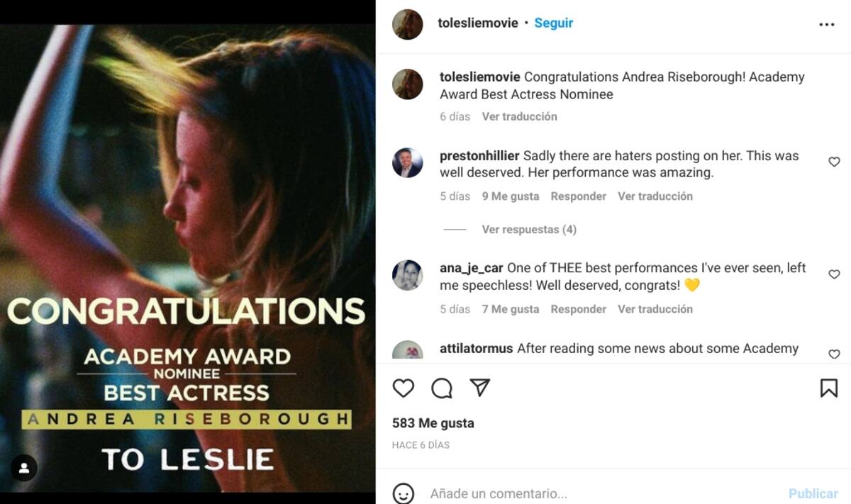 Aunque la academia no llegó a mencionar a "To Leslie" directamente, su preocupación parece centrarse en una publicación de Instagram de la cuenta oficial de la película, que contraviene sus reglas al hacer referencia a Cate Blanchett. La publicación, luego eliminada, citaba una reseña del crítico de cine del Chicago Sun-Times, Richard Roeper. "Por mucho que admiré el trabajo de Blanchett en Tár, mi interpretación favorita de una mujer este año fue la de la camaleónica Andrea Riseborough", dijo.