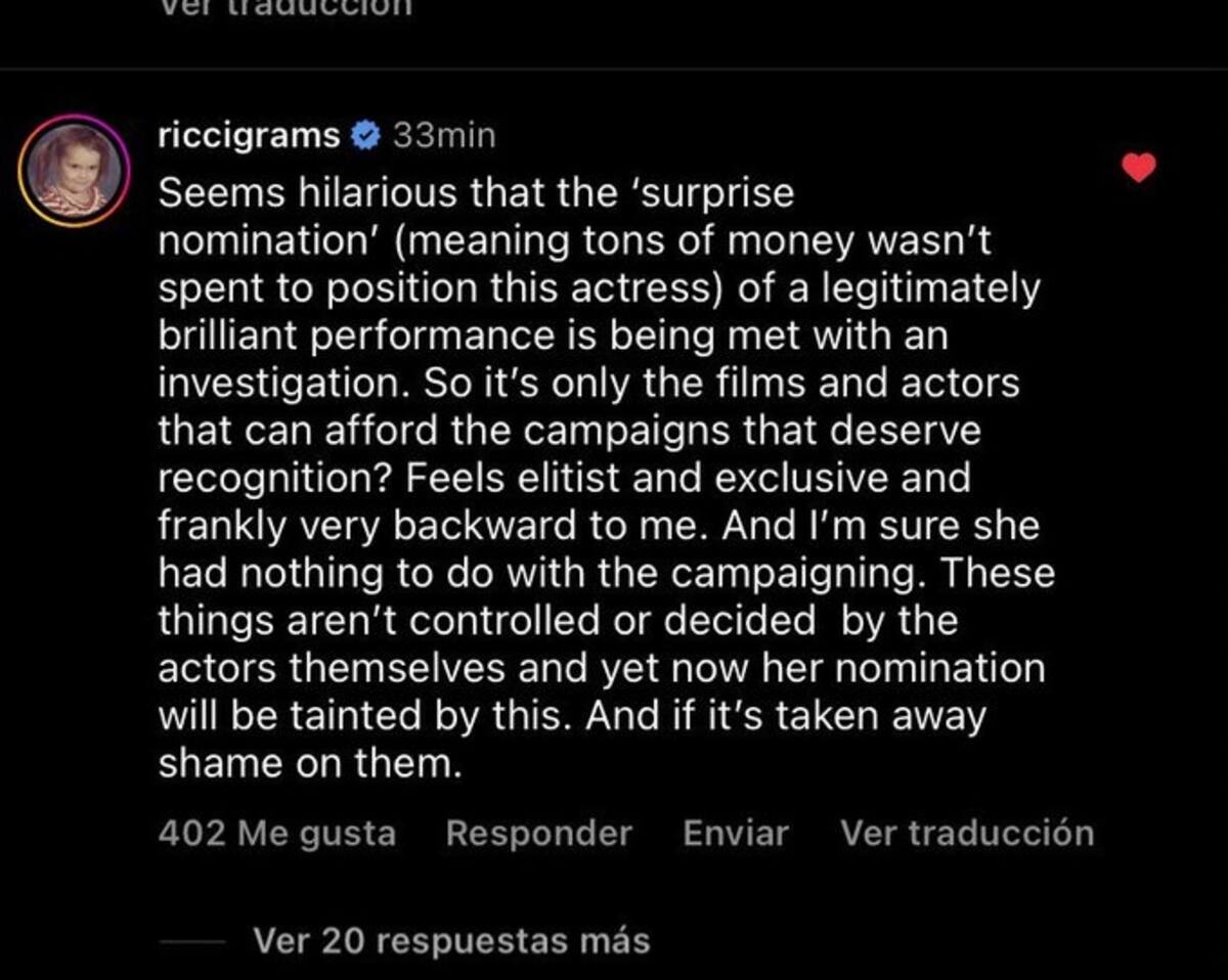 Christina Ricci, por su parte, sostuvo en un tuit ya borrado: "Parece gracioso que la 'nominación sorpresa' (lo que significa que no se gastaron toneladas de dinero para posicionar a esta actriz) de una actuación legítimamente brillante esté siendo investigada", dijo. "¿Entonces solo las películas y los actores que pueden pagar las campañas merecen reconocimiento?... Si se lo quitan, qué vergüenza para ellos".