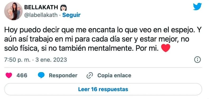 “Hoy puedo decir que me encanta lo que veo en el espejo. Y aún así trabajo en mí para cada día ser y estar mejor, no solo física, sino también mentalmente. Por mí”.