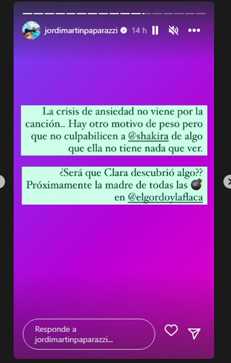 Cabe señalar que Jordi Martí también aseguró que la ansiedad de Clara no es culpa de Shakira: "La crisis de ansiedad no viene por la canción. Hay otro motivo de peso, pero no culpabilicen a Shakira de algo que ella no tiene nada que ver. ¿Será que Clarita descubrió algo?, próximamente la madre de todas las bombas".