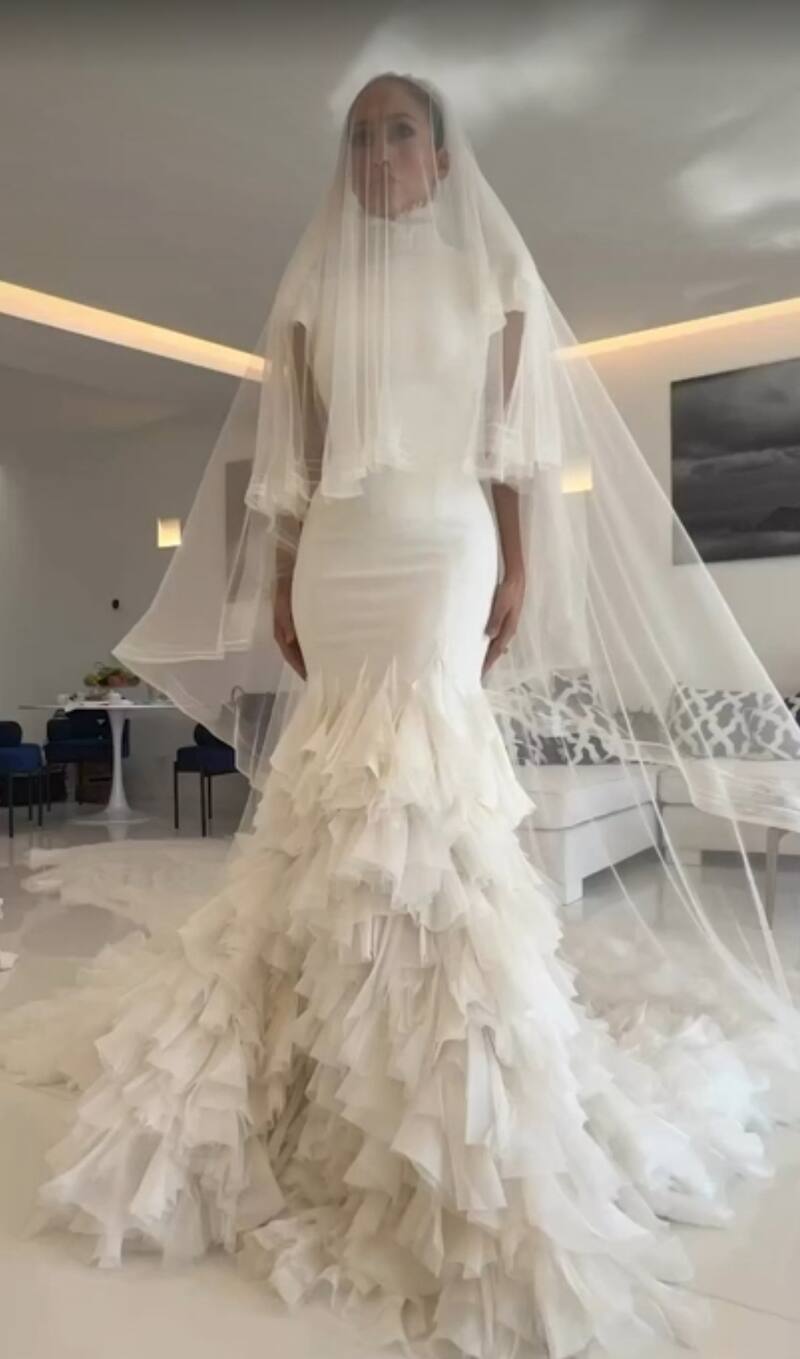 El vestido estilo sirena, que fue el tercer look personalizado que usó para las lujosas nupcias, tenía una cascada de perlas y el otro, estilo silueta de sirena y escote en forma de gota, estaba adornado con cristales de Swarovski.