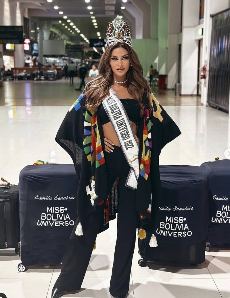 Con un vestido corto de tono pastel al igual que sus tacones y acompañada de todas sus maletas y una bandera de su país, la candidata llegó al aeropuerto para encaminarse a participar en Miss Universo. Esta fue la imagen publicada.