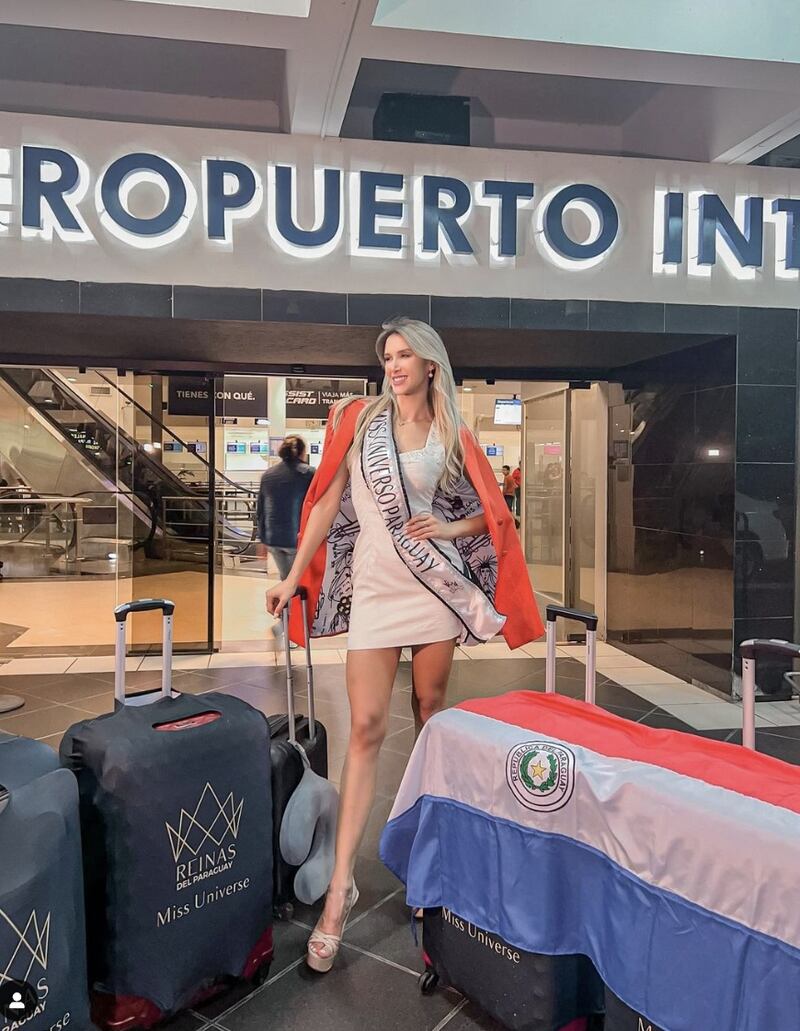 Con un vestido corto de tono pastel al igual que sus tacones y acompañada de todas sus maletas y una bandera de su país, la candidata llegó al aeropuerto para encaminarse a participar en Miss Universo. Esta fue la imagen publicada.