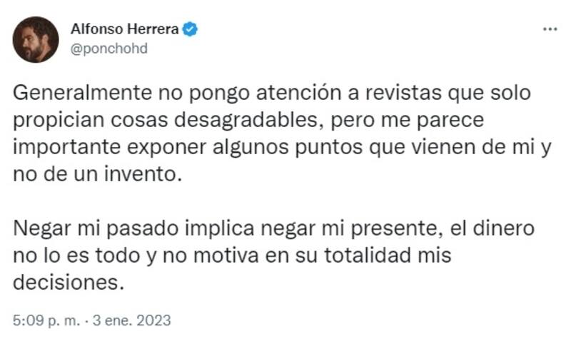 "Generalmente no pongo atención a revistas que solo propician cosas desagradables, pero me parece importante exponer algunos puntos que vienen de mi y no de un invento", comenzó diciendo. Luego, aseguró que "negar mi pasado implica negar mi presente, el dinero no lo es todo y no motiva en su totalidad mis decisiones".