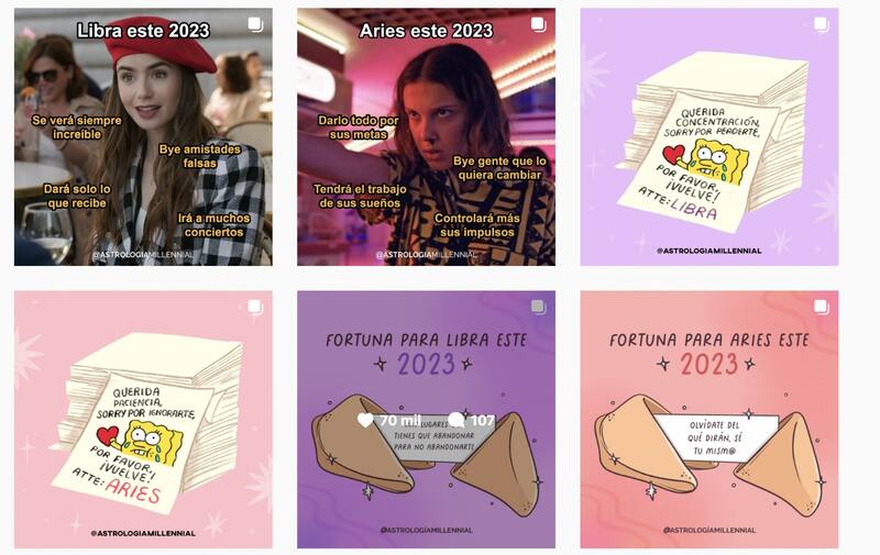 También tiene ilustraciones fantásticas y su parte humorística al comparar los arquetipos de los signos zodiacales con personajes de Emily in Paris, Merlina, Stranger Things y otras series de Netflix, con quien colabora.