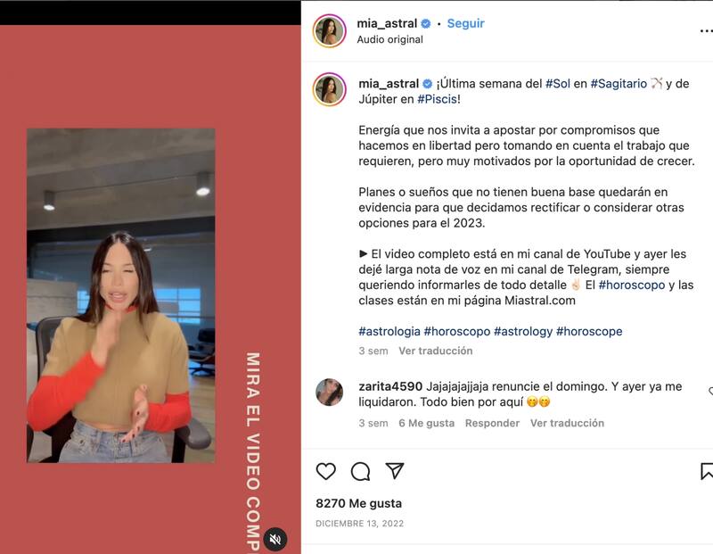 María Pineda, mejor conocida por más de dos millones de seguidores como Mia Astral, es astróloga, conferencista y escritora. Además es instructora de yoga, nutrióloga y especialista en logoterapia, por lo que podrás encontrar en su cuenta de Instagram de todos estos temas contados por una experta.