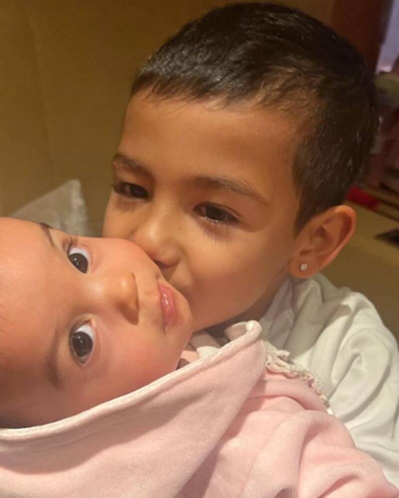 La influencer publicó una preciosa foto de dos de sus hijos, Mateo y la bebé Bella Esmeralda que enterneció las redes de amor al ver a los dos hermanos dándose un beso, sin embargo, muchos otros comentaban el pendiente que ahora luce Mateo: "¿Ese niño tan pequeño y ya tiene pendiente?", decían en el 'post' algunos usuarios de Instagram.