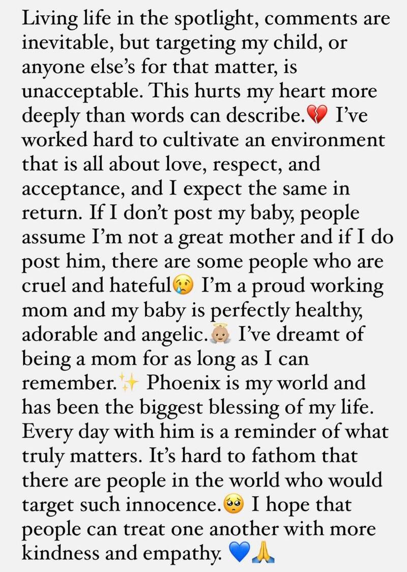 “He soñado con ser mamá desde que tengo uso de razón. Phoenix es mi mundo y ha sido la mayor bendición de mi vida. Cada día con él es un recordatorio de lo que realmente importa”, añadió.