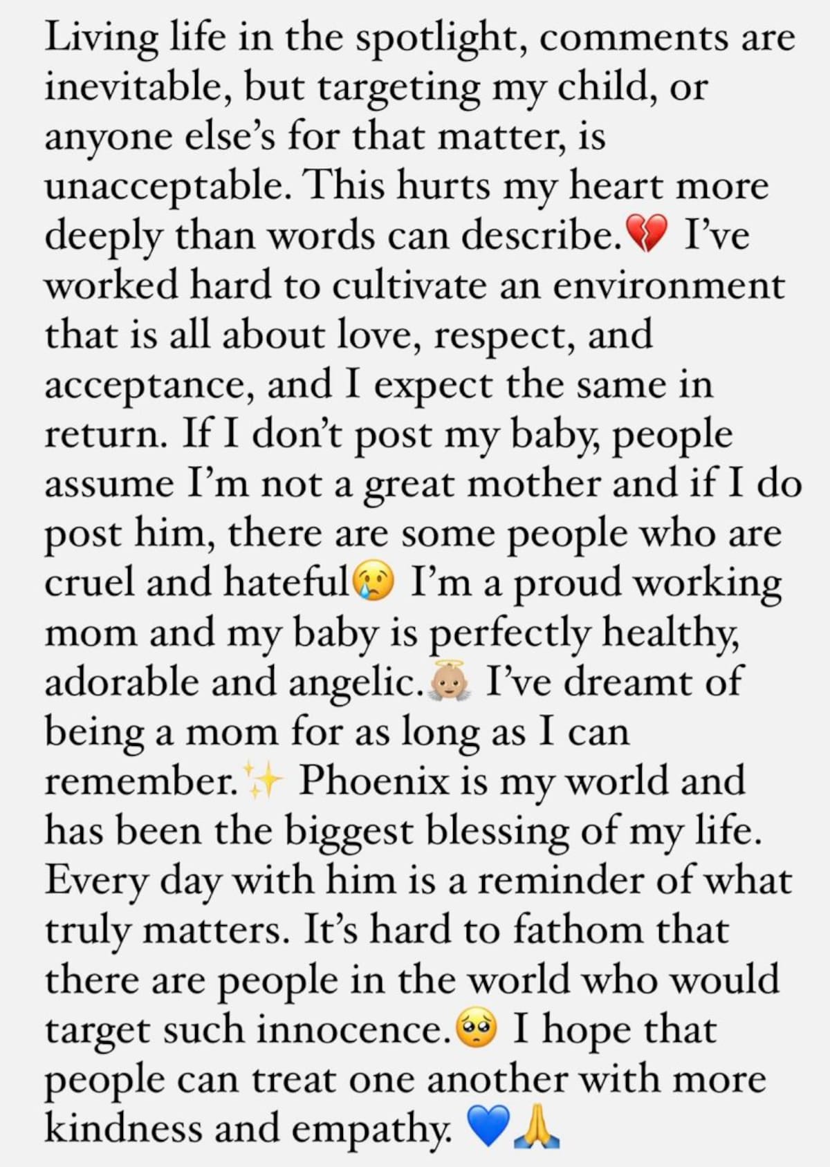 “He soñado con ser mamá desde que tengo uso de razón. Phoenix es mi mundo y ha sido la mayor bendición de mi vida. Cada día con él es un recordatorio de lo que realmente importa”, añadió.