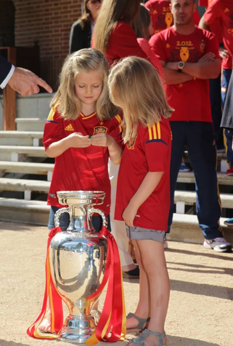 En otra de las fotografías, se puede apreciar a la infanta Sofía junto a su hermana mayor celebrando el triunfo de España en la Eurocopa de fútbol del 2012 a las afueras del Palacio de la Zarzuela.