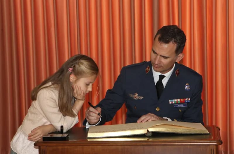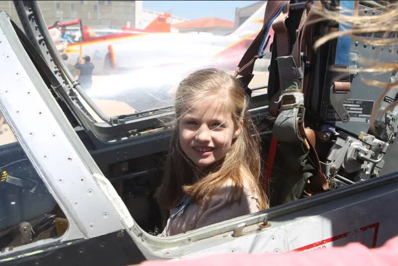 En otra fotografía, Leonor sonríe a la cámara subida sobre un avión de combate durante el aniversario de la XLI promoción de tenientes de la Academia General del Aire de San Javier en Murcia, el que sería su primer acto militar, en el año 2014. Ese mismo día también se la pudo ver junto a su padre, el rey Felipe, mirando atentamente como este firma el libro del evento.