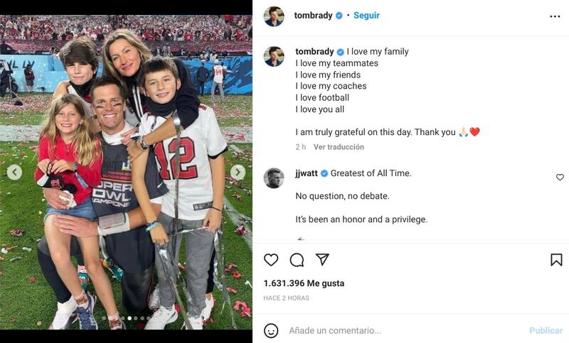 Brady, quien ganó siete Super Bowls, lo hizo a través de un mensaje en video que colgó en sus cuentas oficiales de redes sociales y cuya duración es de apenas 53 segundos. En Instagram lo acompañó con una galería en la que incluso subió fotos con Giselle Bündchen, su exesposa.