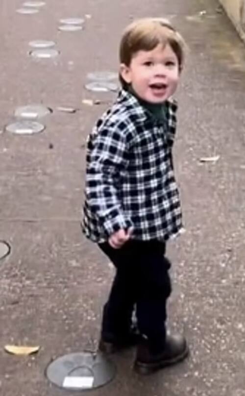 Un clip los muestra en una caminata con el niño pequeño mientras chapotea riendo en los charcos mientras usa botas de agua. Otras fotos lo muestran caminando de la mano con sus padres en la playa.