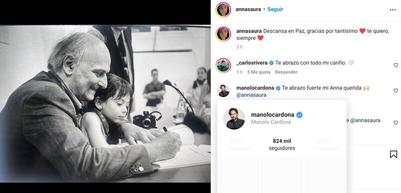 Su hija Anna Saura, con quien trabajó el recién estrenado documental "Las paredes hablan", informó de su muerte con un posteo en Instagram en el que escribió para acompañar una foto a blanco y negro de ella de pequeña con su padre: "Descansa en Paz, gracias por tantísimo, te quiero, siempre".
