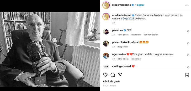 En una publicación aparte, la misma academia española dio a conocer que había entregado el Goya de honor a Saura unos días antes en su casa de Madrid, mostrado una fotografía del cineasta con la estatuilla.