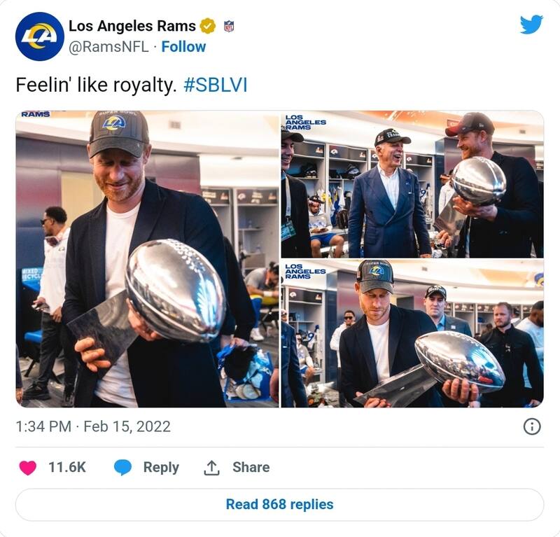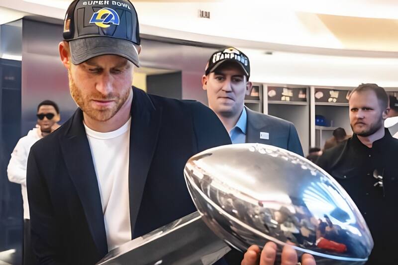 Al hijo menor del rey Carlos se le vio sonreír en todo momento y, por supuesto, los jugadores de los Rams estaban encantados de tener una visita VIP, en el lugar más íntimo donde celebraron el triunfo. Ninguna otra celebridad tuvo acceso al lugar y fue el equipo de futbol el que publicó algunas fotos del Duque de Sussex con el Trofeo Lombardi: "Me siento como la realeza. #SBLVI".