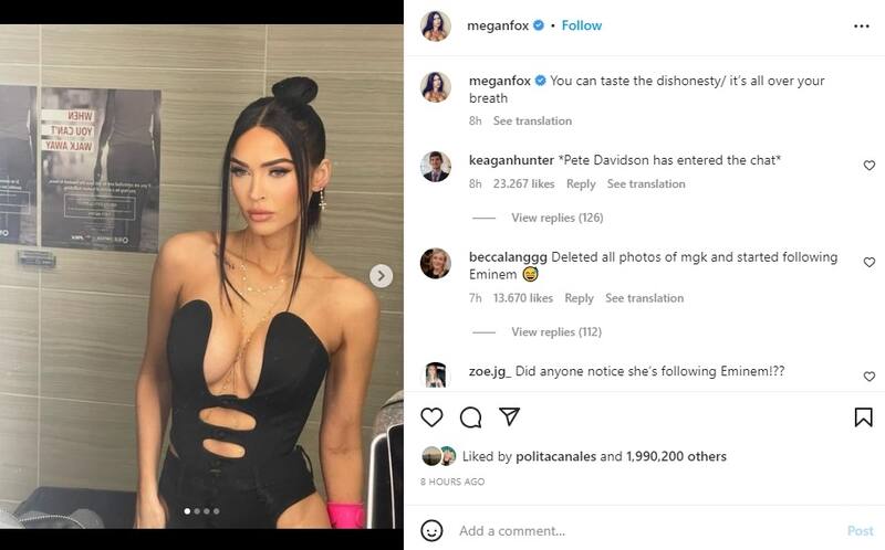 Megan Fox también borró a todos las personas que seguía en Instagram, dejando solo a tres celebridades: Harry Styles, Timothée Chalamet y Eminem. Este último es el que más ha llamado la atención, por la disputa que tuvo con Machine Gun Kelly, quien lo atacó en una de sus letras cuando era rapero.