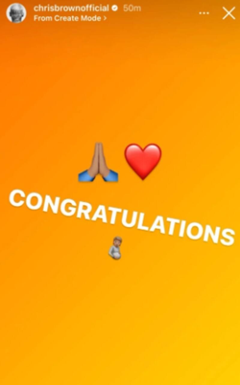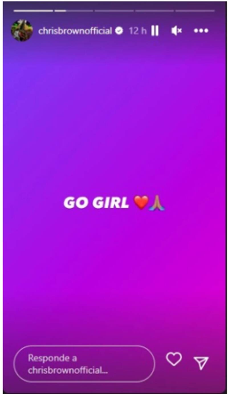 Chris Brown utilizó su cuenta de Instagram para felicitar a la cantante para alentar a la cantante con un corto, pero conciso mensaje: "¡Vamos, chica!", escribió en una storie.