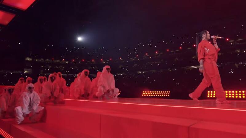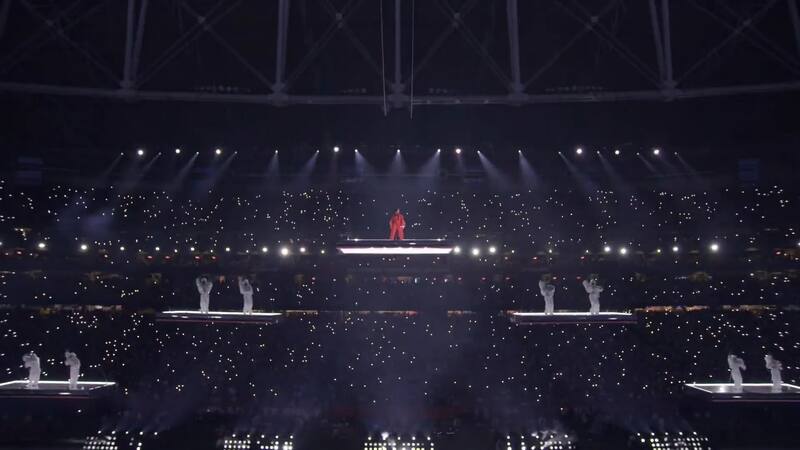 La cantante se lució con un outfit rojo, en un extenso escenario con bailarines vistiendo de blanco y subiéndose a cantar sobre plataformas que se subían varios metros sobre la cancha donde se disputó el Super Bowl.