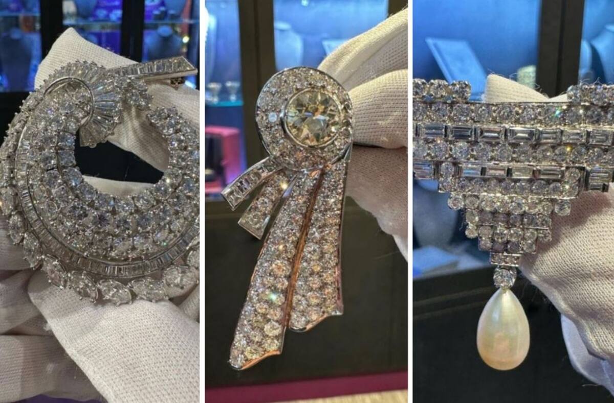 Rihanna también adornó su mono escarlata con joyas, luciendo tres broches de diamantes antiguos diseñados por Joseph Saidian and Sons, que podrían valer un total de 135 mil dólares.