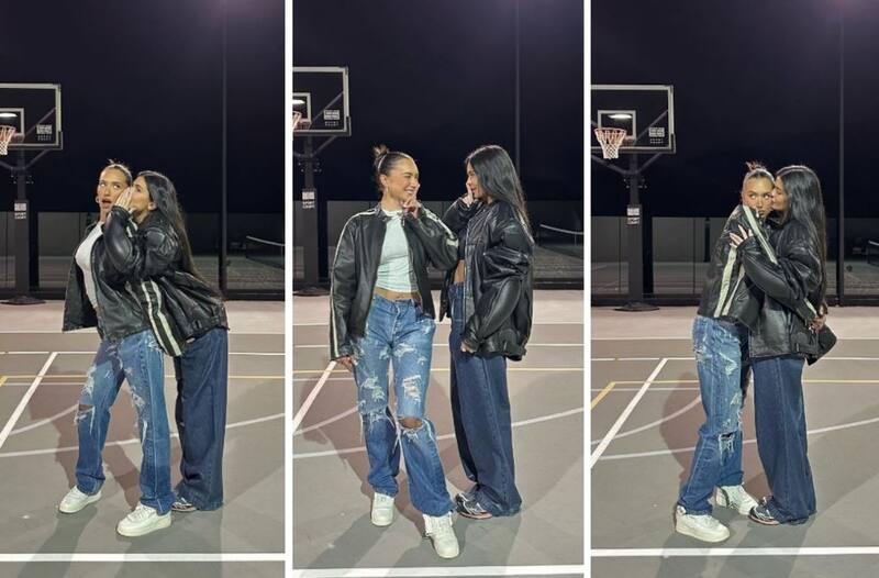 A través de su perfil de Instagram, con más de 380 millones de seguidores, la empresaria de 25 años publicó una serie de fotos en las que posó con su amiga a mitad de una cancha de baloncesto.
