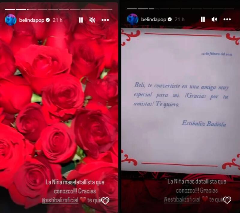 La cantante presumió en su cuenta de Instagram el enorme ramo de rosas rojas junto con una nota con un lindo mensaje, que recibió por parte de Estíbaliz Badiola: "Beli, te convertiste en una gran amiga muy especial para mí, gracias por tu amistad, te quiero, Estibaliz".