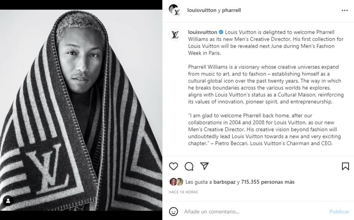 Así lo confirmó el Wall Street Journal, anunciando que su primera colección se dará a conocer durante la semana de la moda masculina en París, que se realizará en el mes de junio. La determinación fue anunciada a través de un comunicado que decía: "Me complace dar la bienvenida a Pharrell de regreso a casa, después de nuestras colaboraciones en 2004 y en 2008 para Louis Vuitton, como nuestro nuevo director creativo de hombres".