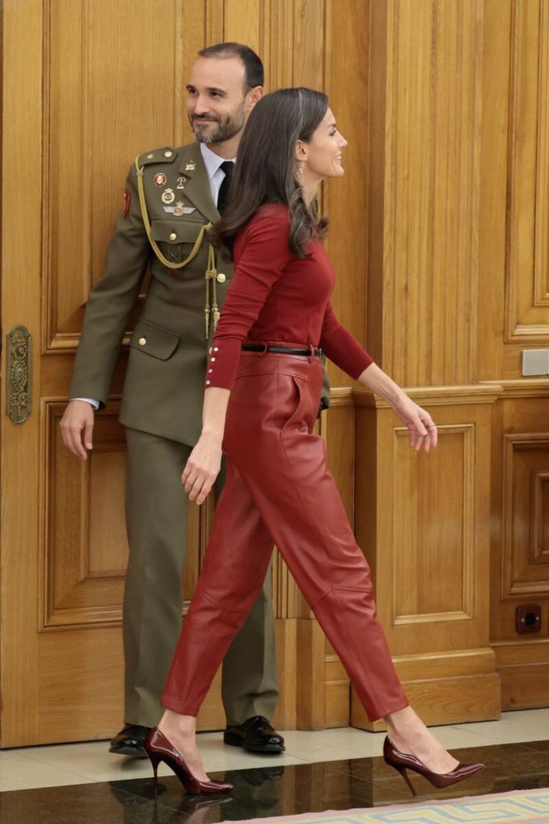 Se trata de un pantalón de napa roja que combinó con un jersey básico de punto fino, con detalle de botones dorados en las mangas, ambos firmados por una de sus marcas de referencia, Hugo Boss. Estas dos prendas las combinó con unos salones con lateral curvado, de charol, y en un tono muy similar, de Lodi.