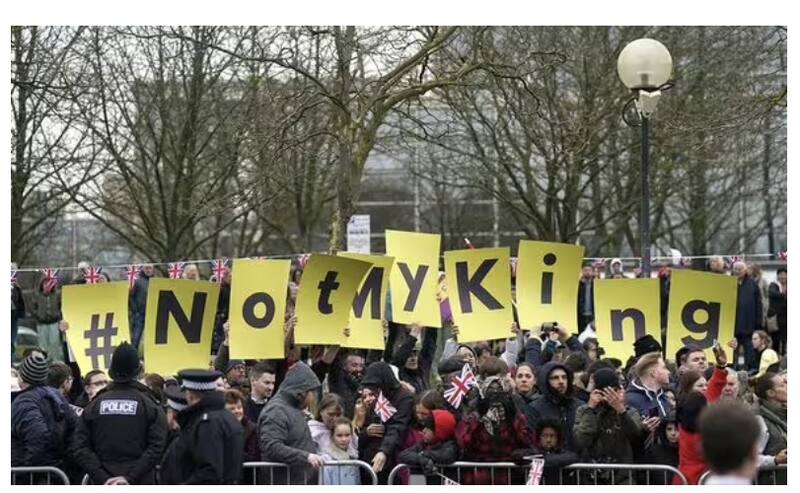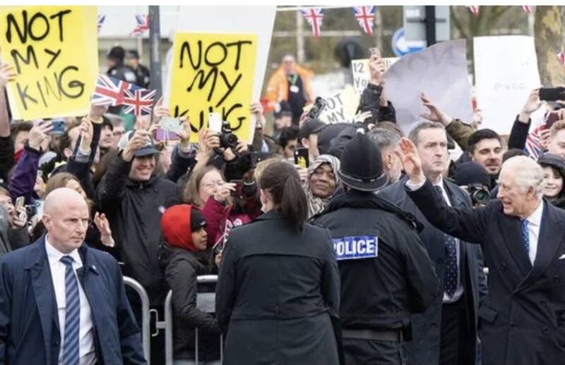 El rey Carlos llegó a The Church of Christ the Cornerstone en la ciudad inglesa, Milton Keynes y encontró a los manifestantes dándole la bienvenida con abucheos y cánticos antimonárquicos, los cuales fueron organizados por el grupo Republic.