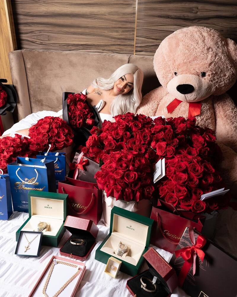 Entre los regalos había anillos, collares, pulseras y relojes con diamantes de distintas marcas como Cartier y Rolex, además un oso de peluche gigante, decenas de rosas rojas y una tarjeta en la que se lee: "Feliz día del amor y la amistad. Te amo", aunque no se alcanza a apreciar el remitente.
