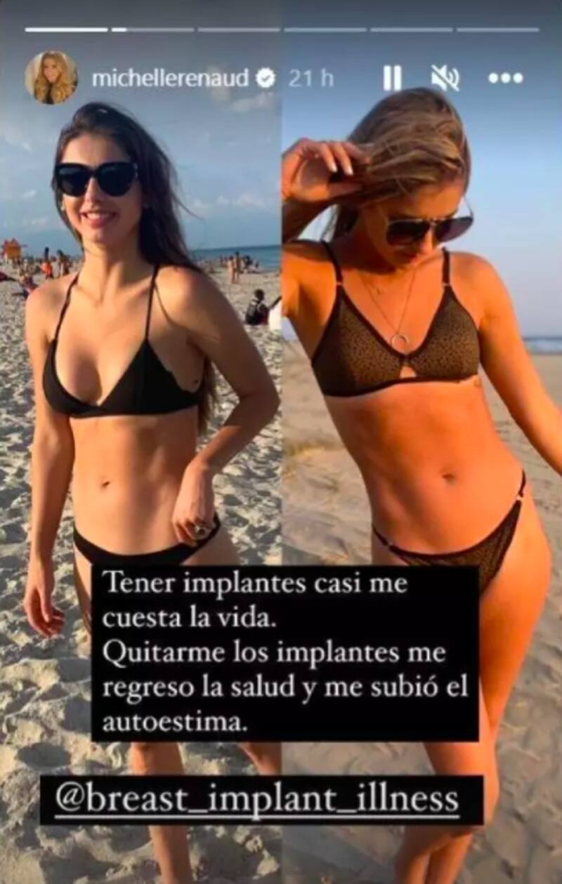 El pasado 16 de febrero contó abiertamente todo lo que vivió tras enterarse que debía quitarse los implantes. A través de sus historias de Instagram, Michelle Renaud compartió algunas fotografías del antes y después de la cirugía.