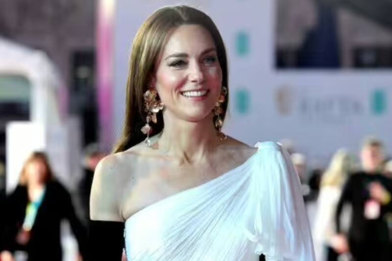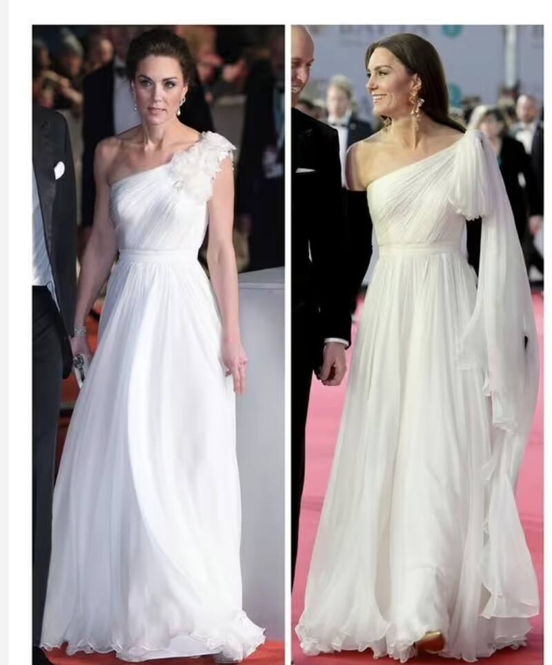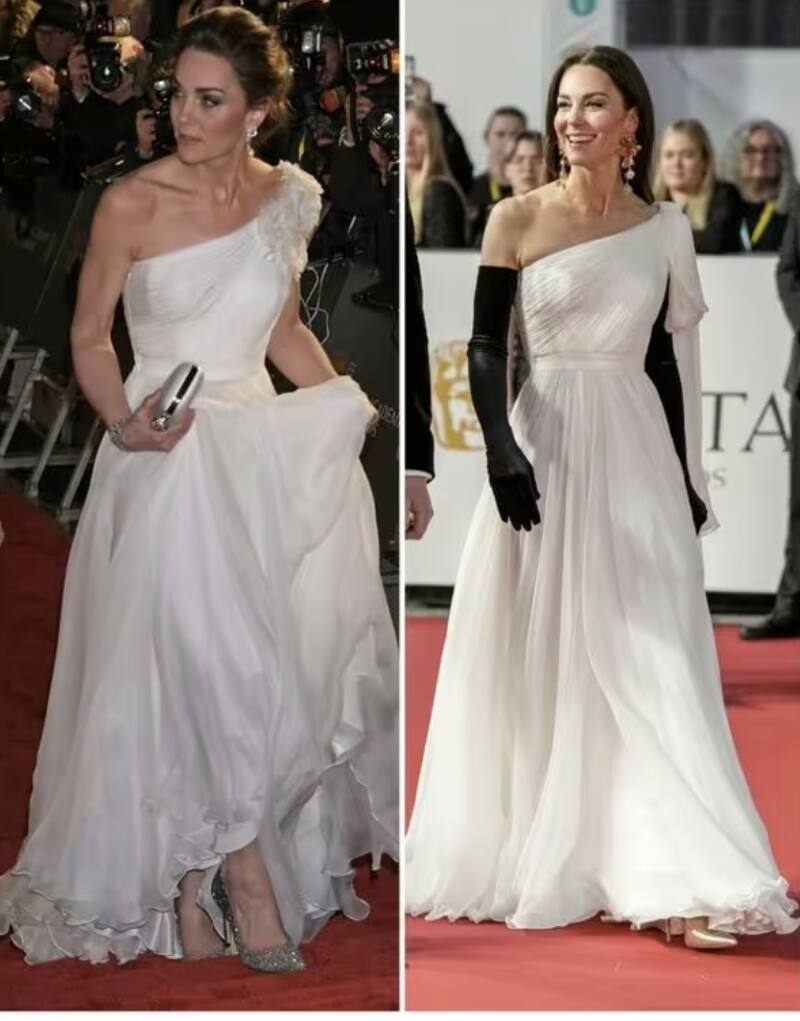 El vestido de estilo griego se vio por primera vez en los premios BAFTA 2019. Pero Kate cambió la apariencia de los hombros del vestido, sus joyas, sus zapatos, sus guantes y su bolso de mano.