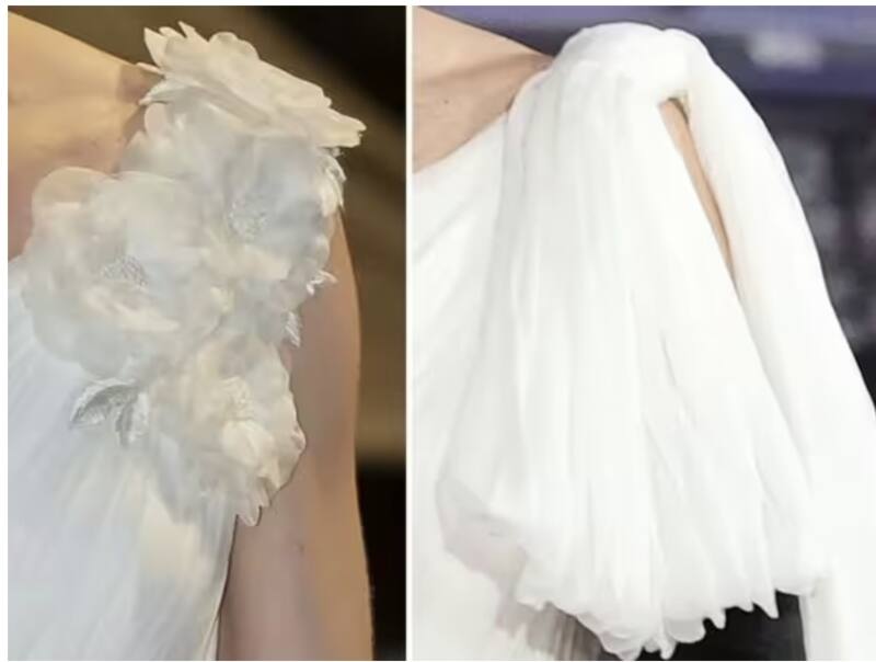 Para el compromiso del domingo por la noche, el vestido se actualizó con modificaciones en el hombro izquierdo. Se quitaron los pétalos florales y se agregó tela adicional.