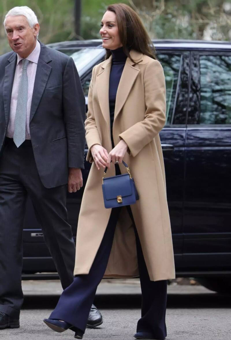 Kate Middleton llegó al lugar vistiendo una blusa, pantalón, tacones y bolso en el mismo tono azul marino y elevó su outfit monocromático con un abrigo largo en color camel de Max&Co que ha demostrado ser su favorito. Una vez dentro de Oxford House Nursing Home, la princesa de Gales usó una mascarilla de estampado floral en todo momento para proteger a las personas de la tercera edad.
