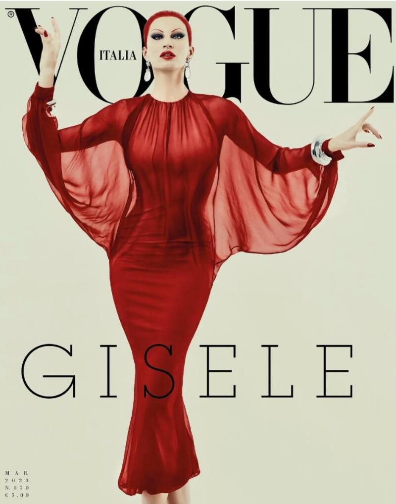 Bündchen aparece irreconocible en la portada de Vogue Italia en su edición de marzo 2023 usando un vestido con transparencias de Valentino, el pelo rojo y corto y un look muy vintage.