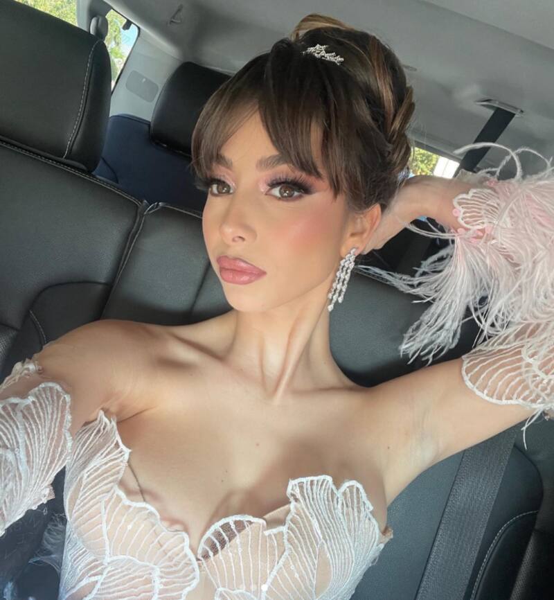 Para el gran evento la hija menor de Marco Antonio Solís optó por usar un vestido con transparencias, encajes y plumas en tonos claros. A través de su cuenta oficial de Instagram la joven de 22 años hizo un acercamiento a los detalles de su look mientras se dirigía en su coche a la ceremonia.