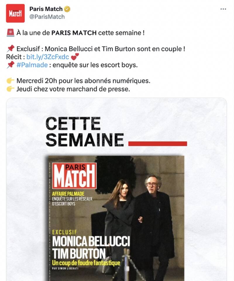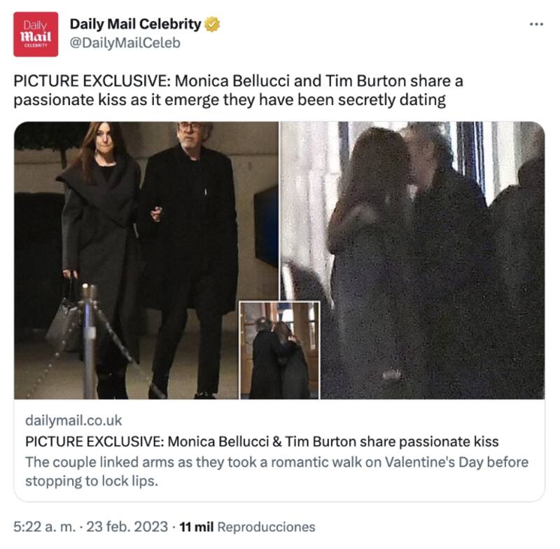 Según lo afirmó el diario Mail Online hace algunas horas, se rumoraba que Monica Bellucci, de 58 años, y el director de cine Tim Burton, de 64, estarían saliendo en secreto desde hace cuatro meses.