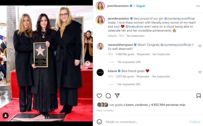 Courtney Cox fue homenajeada con su propia estrella en el Paseo de la Fama de Hollywood, el pasado lunes, en una ceremonia que llamó la atención por la ausencia de la mitad del elenco de "Friends".