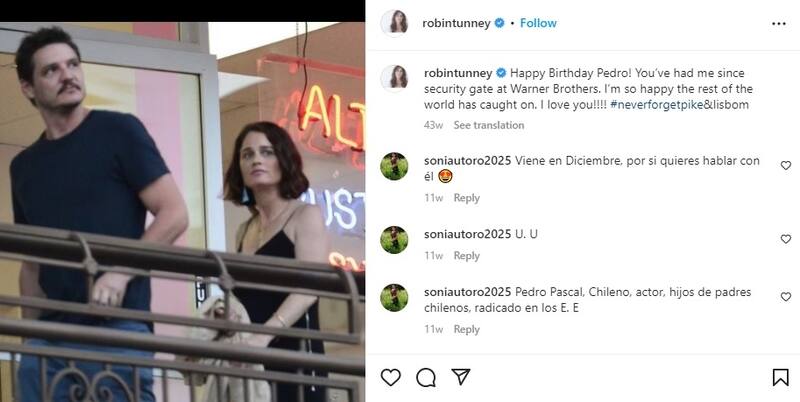 Otras de las actrices con las que Pedro Pascal fue fotografiado en público fue Robin Tunney. La pareja fue sorprendida en Hollywood, en julio de 2015 y dos meses después asistieron juntos a los Emmy de ese año. Los actores compartieron set en "The Mentalist" y fueron vistos juntos por última vez en julio de 2019. Una vez más, este romance no fue confirmado.