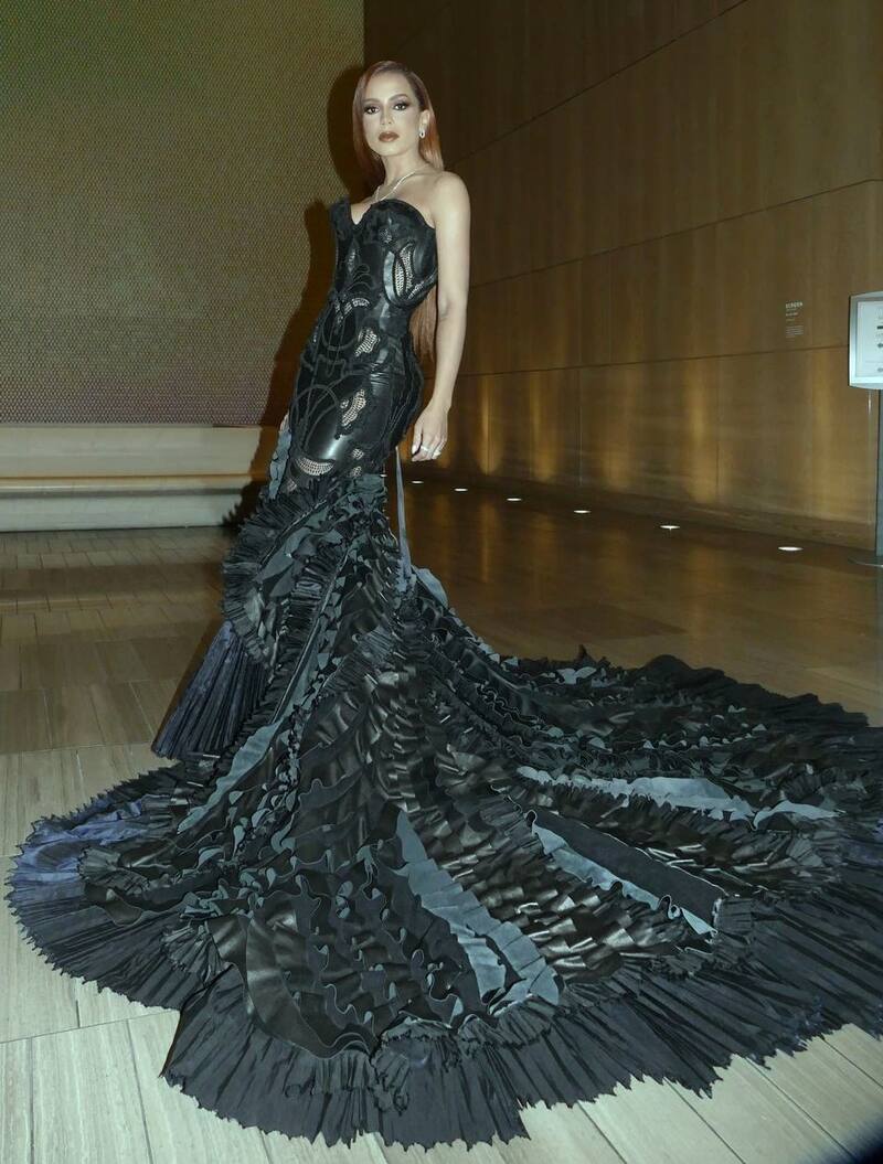 La cantante de 29 años desfiló en la alfombra con un espectacular vestido negro de Atelier Versace, de la colección de primavera-verano. Explicó: "es una pieza vintage única de la misma manera como me siento ahora. No lo pueden conseguir en ningún lado, como a mí".