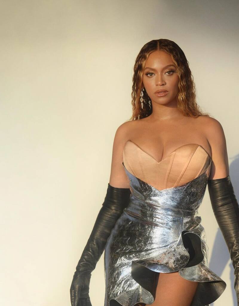 Beyoncé se presentó a los premios con un vestido color metálico, guantes de piel y un córset color nude.