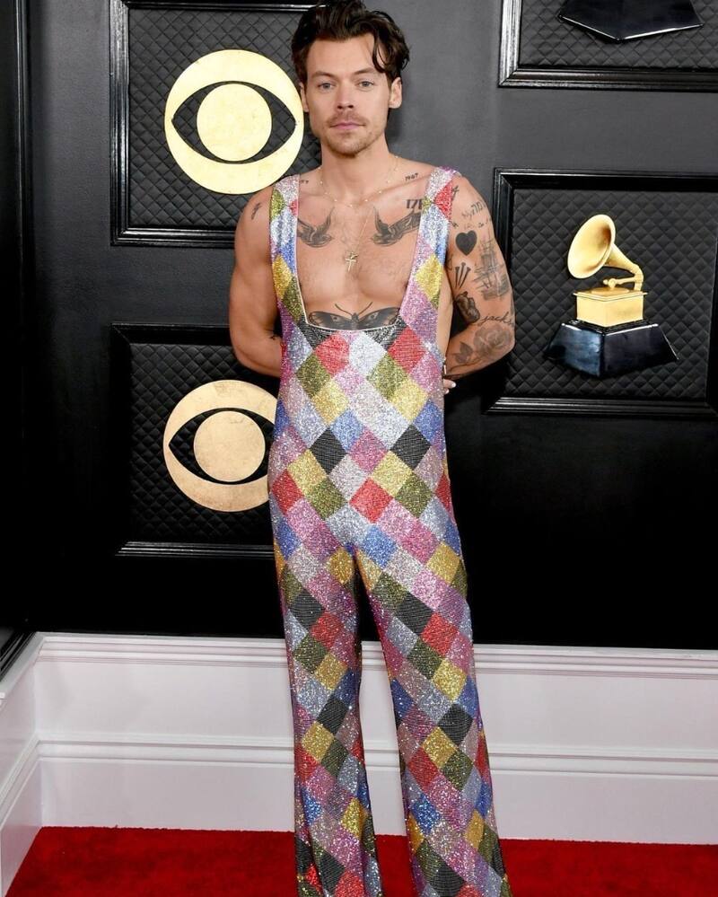 Harry Styles llegó con un brillos traje de una sola pieza diseñado por Egonlab.