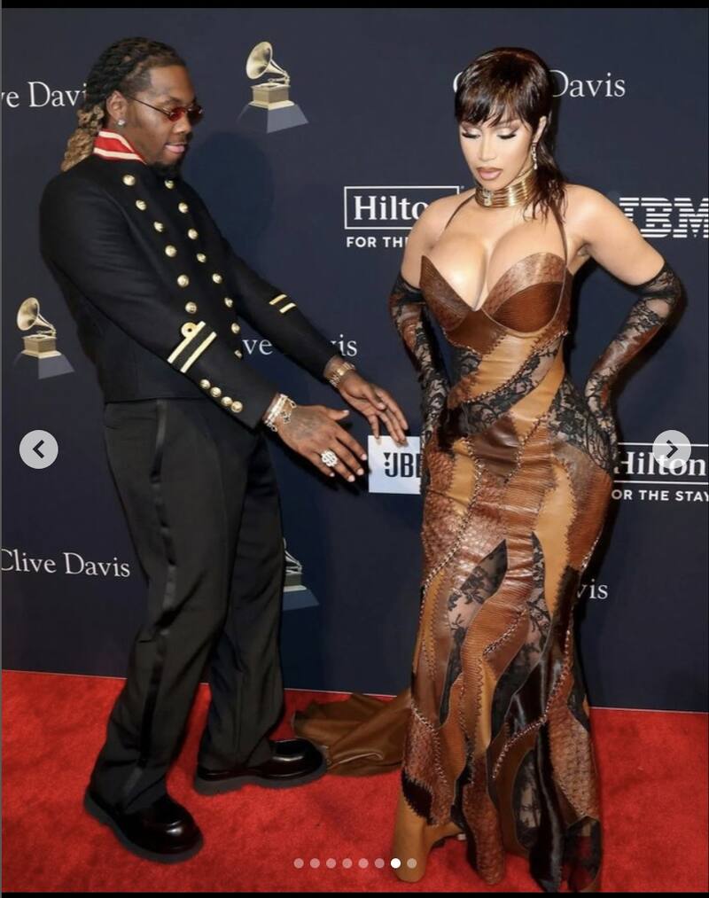 Cardi B llegó a la alfombra roja con su esposo Offset. La cantante portó un atrevido vestido de retazos, un diseño personalizado de Roberto Cavalli por Fausto Puglisi, su atuendo vanguardista se acentuó con guantes a juego, una gargantilla de oro y diamantes en niveles y aretes colgantes rectangulares brillantes.