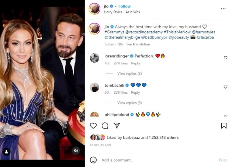 Pese a ello, sus seguidores no dejaron pasar la falta de interés de Ben Affleck durante los Grammy 2023. "Ben no parece feliz", "Ben parecía aburrido y muy infeliz", "Deja a Ben en casa. Claramente no es lo suyo" y "¿Por qué parece que Ben tiene dolor todo el tiempo?", son algunos de los comentarios que se repiten en la publicación.