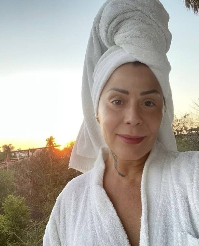 En esta ocasión se puede admirar a la hija de Silvia Pinal luciendo una bata de baño en color blanco a juego con la toalla que envolvía su cabeza.