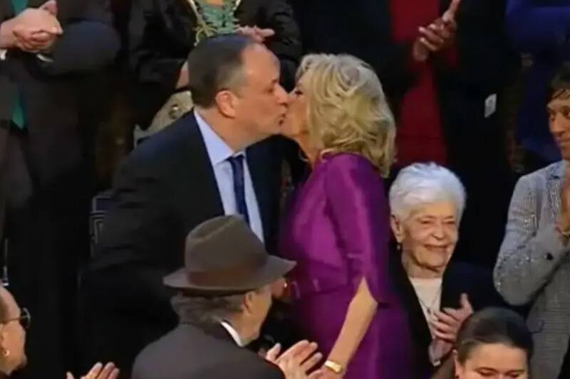 Después de que la esposa del presidente de Estados Unidos llegara al lugar en donde tenía que sentarse, saludó al esposo de la vice presidenta, Kamala Harris, ambos se tomaron de las manos y sorprendentemente, se dieron un beso en la boca.